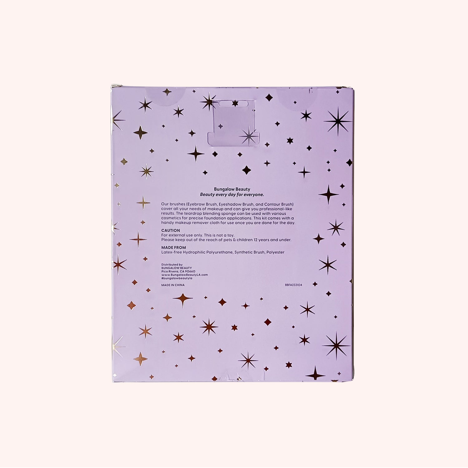 Elevate your makeup routine with the Bungalow Beauty Makeup Tool Kit, featuring a luxurious set of three professional-quality brushes in a charming purple colour scheme. This comprehensive kit includes precisely crafted brushes for various applications, complemented by a specially designed beauty blender for seamless product application. The soft, dense bristles ensure optimal product pickup and smooth distribution, while the ergonomic purple handles provide comfortable grip and control. The included makeup remover cloth adds convenience to your beauty regimen, making cleanup effortless. The beauty blender's teardrop shape allows for precise application in hard-to-reach areas. Packaged in an elegant star-studded box with gold accents, this kit makes for a delightful addition to any vanity table or an excellent gift for makeup enthusiasts. The versatile brush selection caters to different makeup techniques, from detailed eye work to broader face application, making it suitable for both beginners and experienced makeup users.