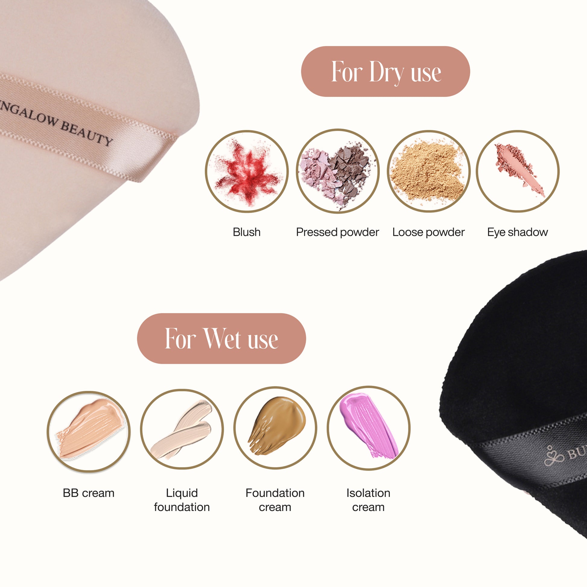 Elevate your makeup application with these luxurious Bungalow Beauty powder puffs. This set of two pink velvet puffs features a premium soft-touch finish that ensures smooth and even distribution of loose or pressed powder products. The classic triangular shape allows precise application in hard-to-reach areas like under the eyes and around the nose. Each puff is adorned with an elegant branded ribbon, adding a touch of sophistication to your beauty routine. The plush velvet material is gentle on the skin while providing optimal powder pickup and release for a flawless finish. Perfect for both professional makeup artists and everyday use, these powder puffs are an essential addition to any cosmetic collection. The durable construction ensures long-lasting performance, while the classic black colour maintains a clean, professional appearance over time. Keep your makeup routine refined and professional with this sophisticated set of powder puffs.