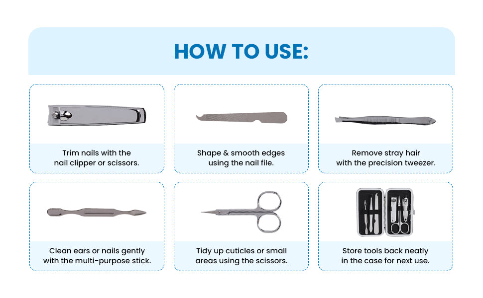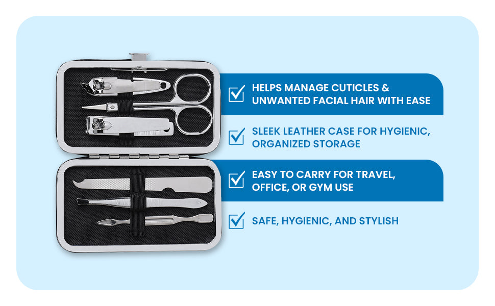 - The kit contains 6 tools: 1 pc cuticle Stick / 1 pc Tweezers / 1 pc Nail File / 1 pc Scissors / 2 Pc Nail Clippers, Stainless Steel, PVC, with Case
