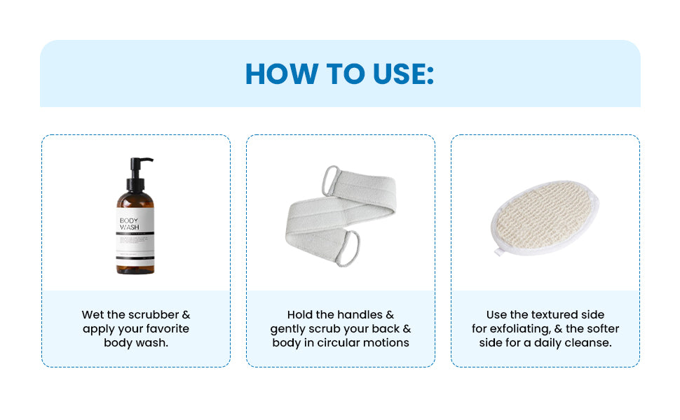 - A versatile skincare tool that can be used daily in the shower or bath with your favorite shower gel or soap. The unique texture of the back scrubber for shower helps to remove dead skin cells, unclog pores, and promote healthy blood circulation, resulting in smoother and healthier skin. It is a simple yet effective way to maintain healthy and radiant skin, use by immersing it in warm water before bathing.