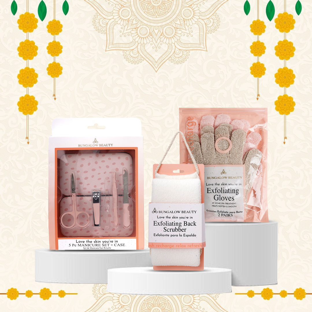 Self-Care Essentials Set – 5 Pc Manicure Set, Back Scrubber & Pink Gloves (2 Pack)